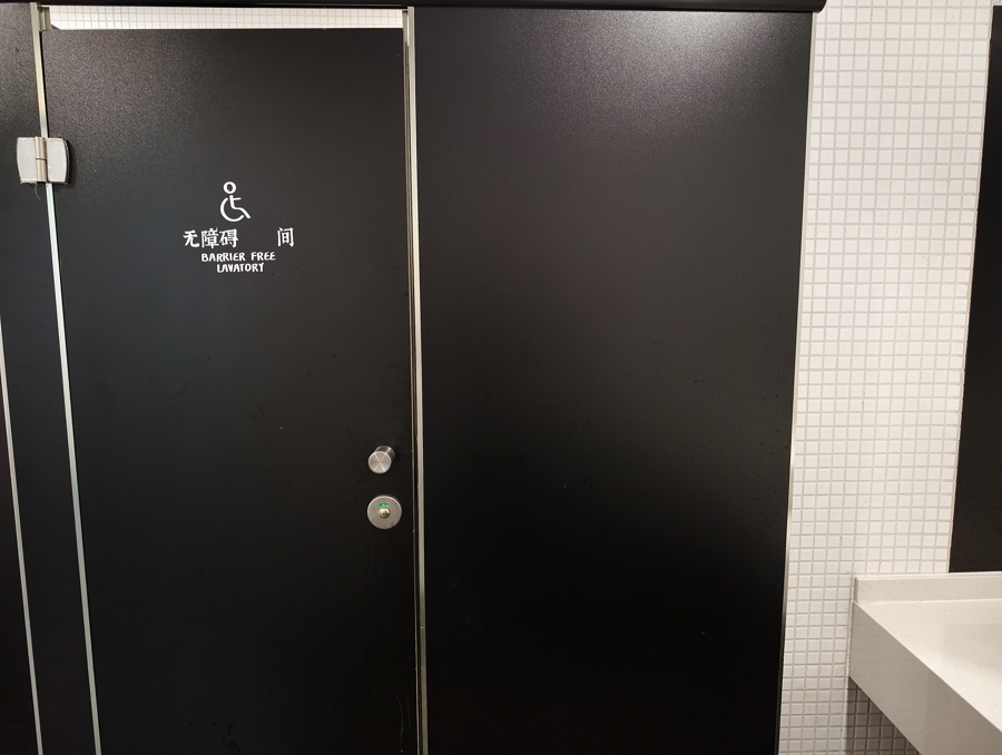 在第二间无障碍厕所前,记者两只手一起拉住门把手,用尽力气才打开移门。目测是移门滑轮出现故障,所以卡顿严重。对坐在轮椅上的残障人士,或者手部力量较弱的人士而言,这无异于一道“无法逾越的门”。