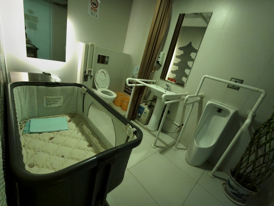 美罗城第一间无障碍厕所中,婴儿尿布床占了很大的空间