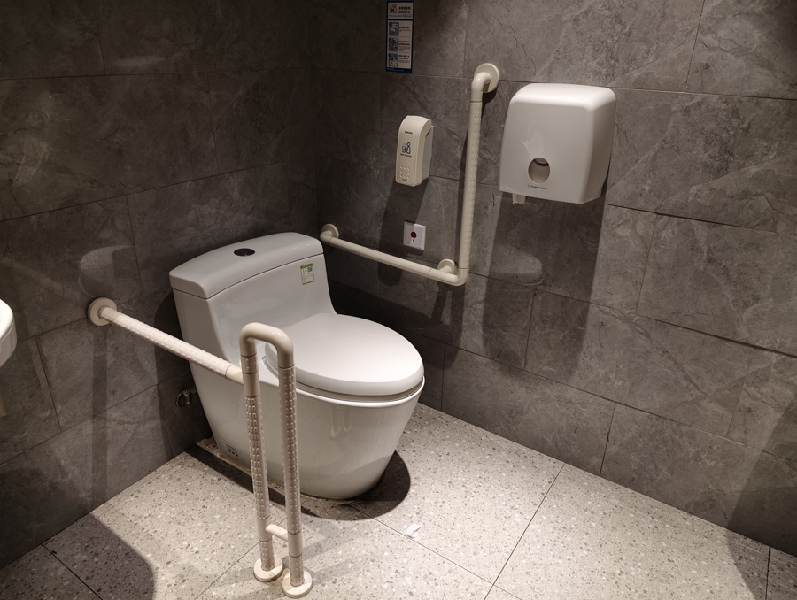 中山公园龙之梦无障碍厕所坐便器上的扶杆令人难以理解,紧急求助按钮的位置也很高,一旦摔倒根本按不到