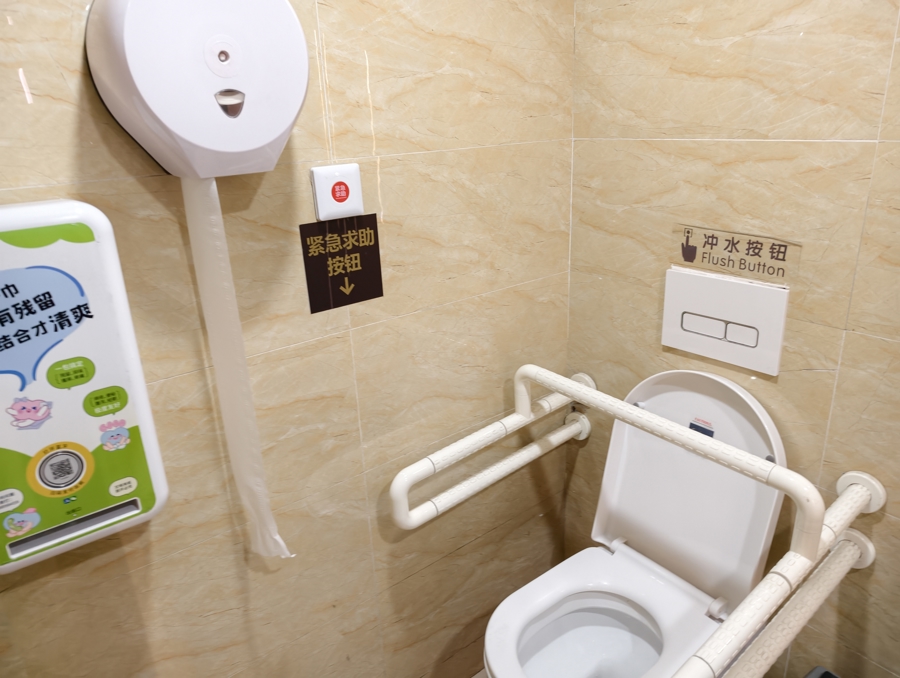 不少厕所里的紧急求助按钮位置很高,或者被坐便器、垃圾箱等遮挡,一旦滑倒,根本按不到;